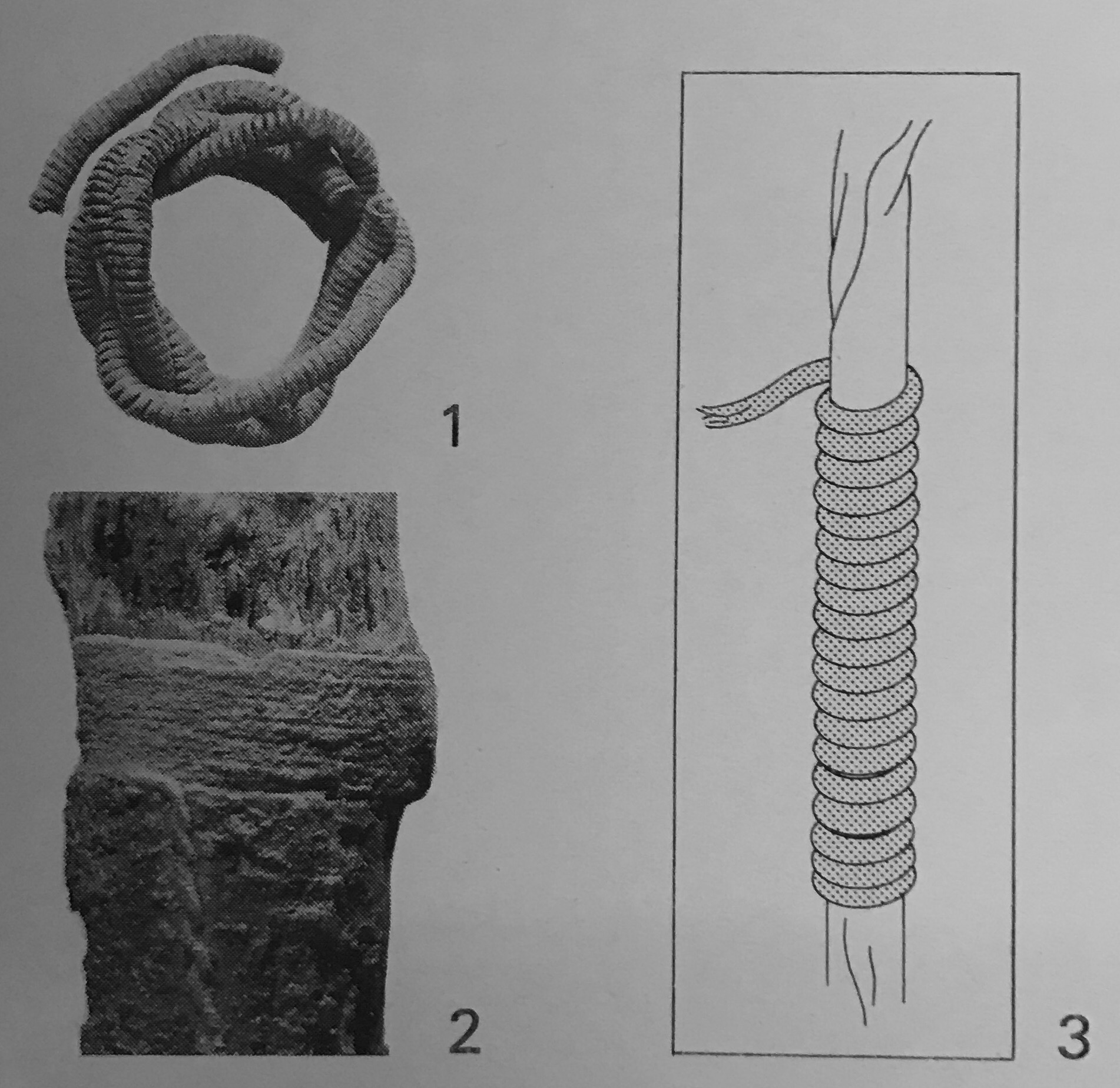 - Abb. 124 Haithabu. Gräber. 1 fragmentarischer Posamentknoten aus Spiralsilber (Grab 188/1960; vgl. Abb. 86.4). 2 Silberumwicklung an Kleingerät (Pfriem?; Grab 188/1960). 3 schematische Darstellung von Spiralsilberdraht: Ein gezogener Silberdraht ist um einen Faden gesponnen.